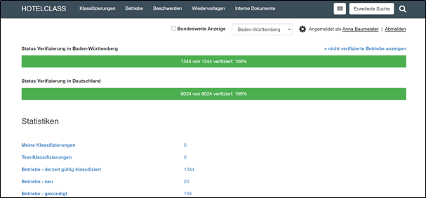Das Dashboard liefert statistische Informationen und zeigt den Status der verifizierten Daten im jeweiligen Bundesland an. Die gelisteten Aspekte unter dem Unterpunkt Statistik können zusätzlich als Schnelleinstieg genutzt werden. Die Filter sind so eingestellt, dass nur Einträge angezeigt werden, die für den angemeldeten Benutzer relevant und freigeschalten sind. Hier können Sie z.B. direkt Ihre Betriebe mit offenen Beschwerden, Betriebe im Status Monitoring und usw..