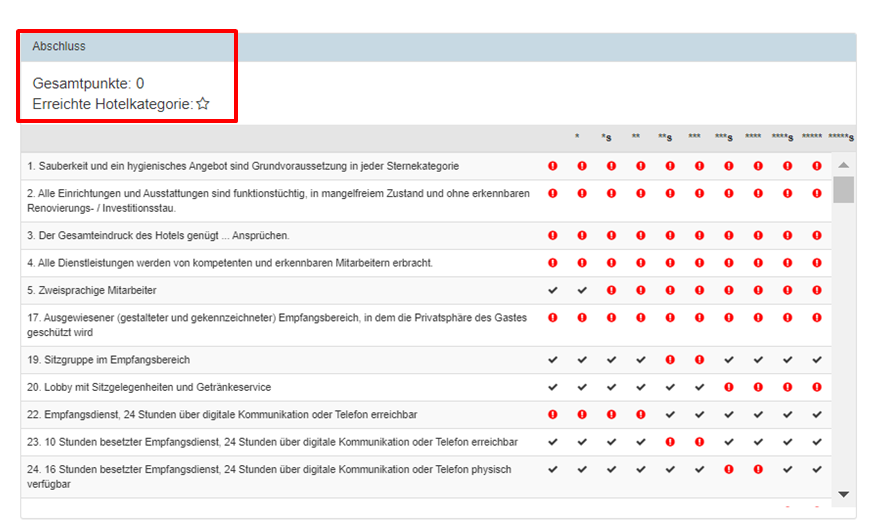 - Abschluss: Am Ende der Klassifizierung werden die erreichte Gesamtpunkt und die erreichte Sternekategorie angezeigt. Nicht erreichte Mindestkriterien, der einzelnen Sternekategorien werden mit einem roten Ausrufezeichen gekennzeichnet.