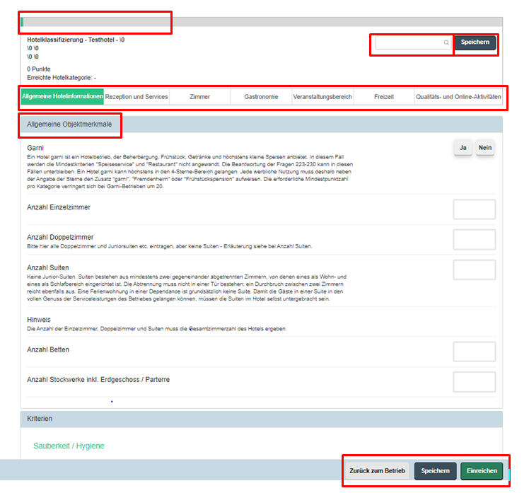 - Kategorien: Die Kategorien spiegeln die Obergruppen des Kriterienkatalogs wieder (z.B. Allgemeine Hotelinformation, Zimmer, Gastronomie etc.) und können mit einem Klick ausgewählte werden um direkt zu der Obergruppe des Kriterienkatalogs zu gelangen