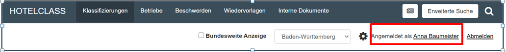 Im Kopfbereich wird die aktuelle Anmeldung angezeigt.