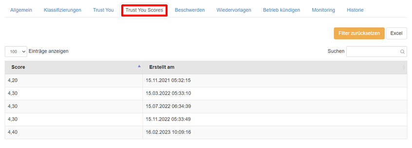 Nach Bedarf können diese Scores abgespeichert werden und Veränderungen können über eine Zeitspanne hinweg beobachtet werden. Dieses kann man in dem entsprechenden Feld "Trust You Scores" einsehen.